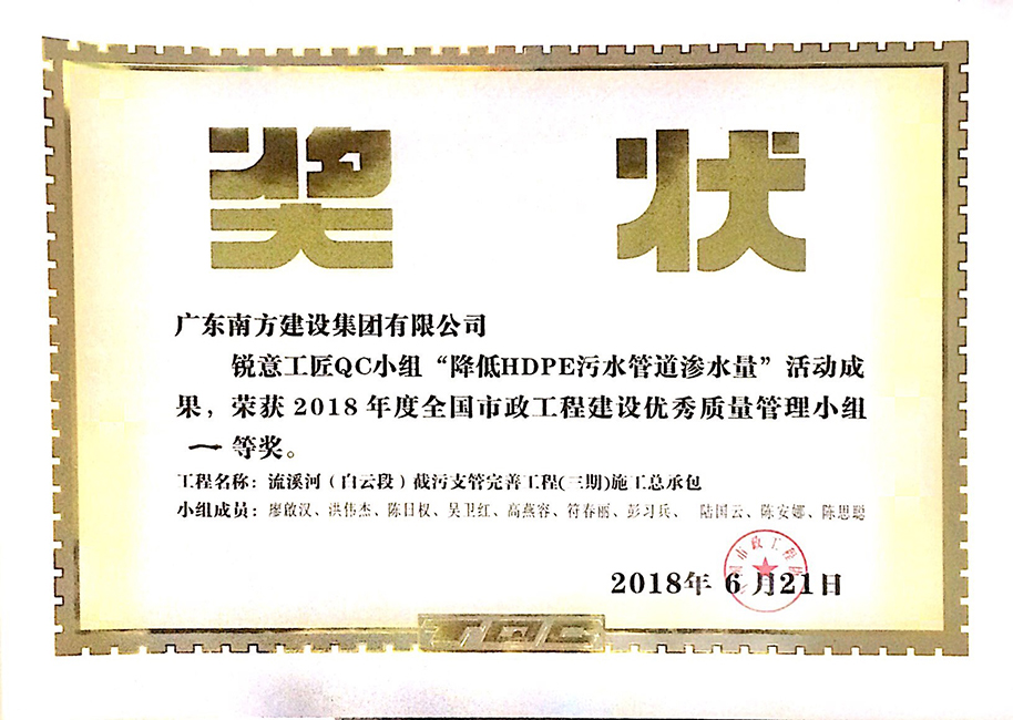 • 南方-2018年度全國(guó)市政工程建設(shè)優(yōu)秀質(zhì)量管理小組一等獎(jiǎng)