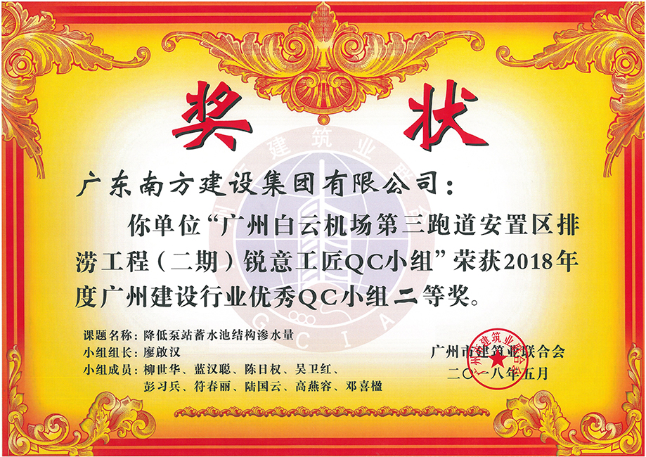 • 南方-2018年度廣州建設(shè)行業(yè)優(yōu)秀QC小組二等獎(jiǎng)