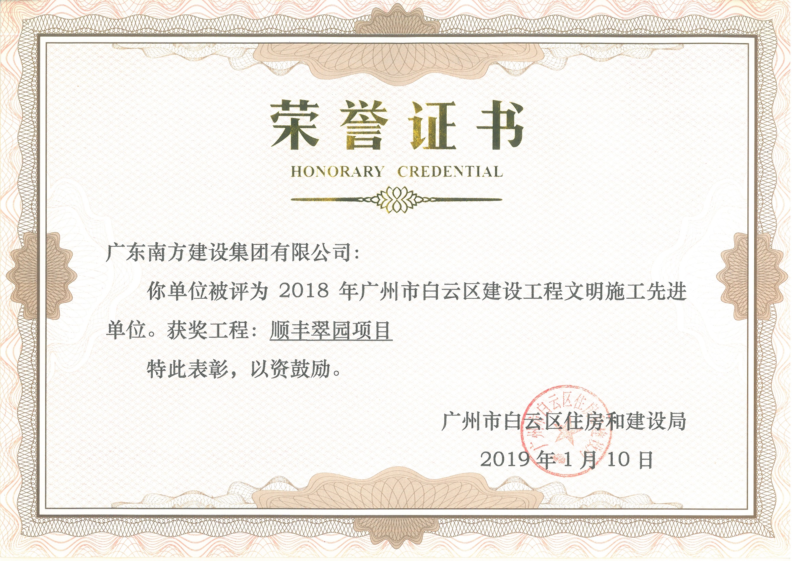 • 2018年廣州市白云區(qū)建設(shè)工程文明施工先進(jìn)單位-順豐翠園項(xiàng)目