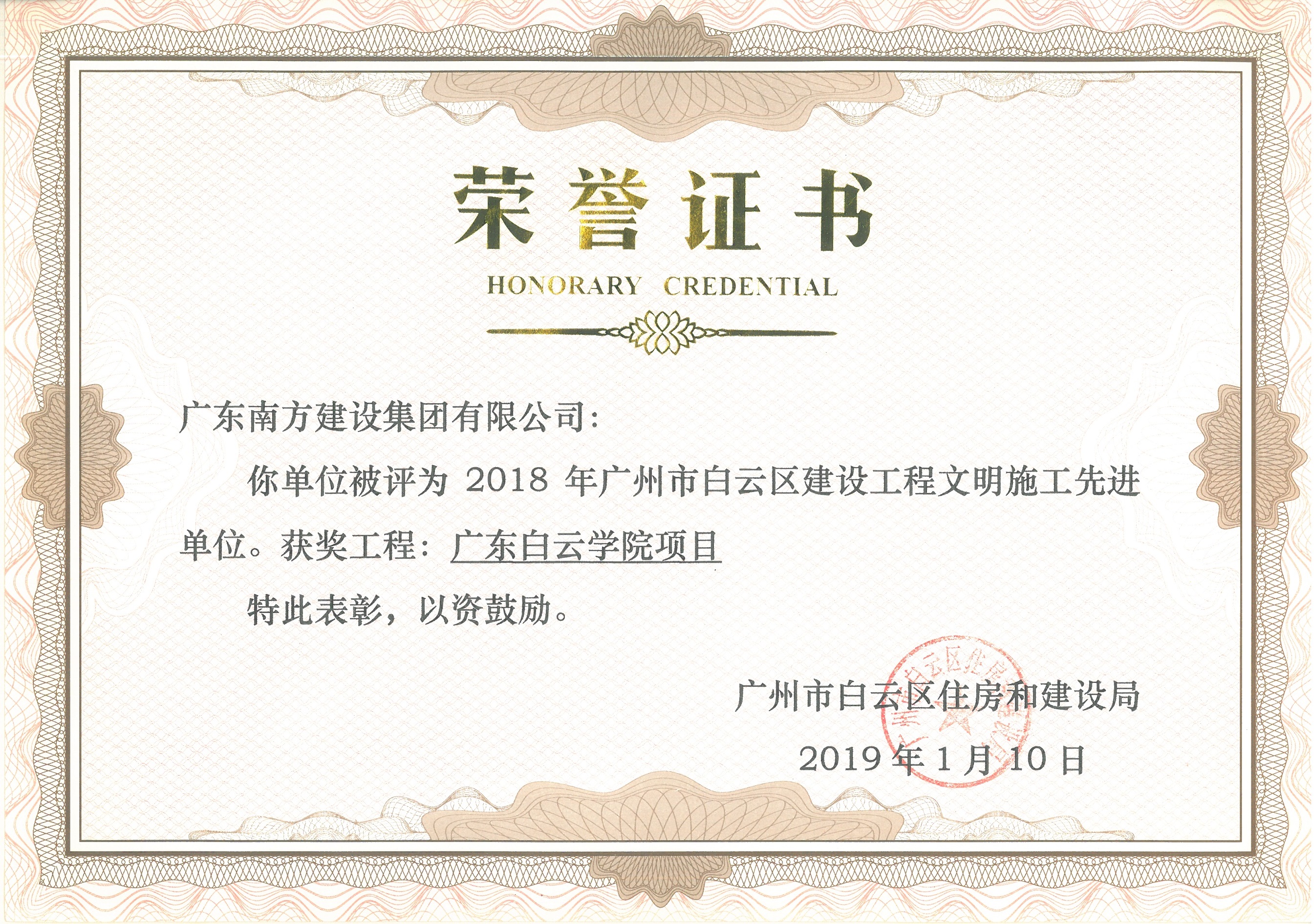 • 2018年廣州市白云區(qū)建設(shè)工程文明施工先進(jìn)單位-廣東白云學(xué)院項(xiàng)目