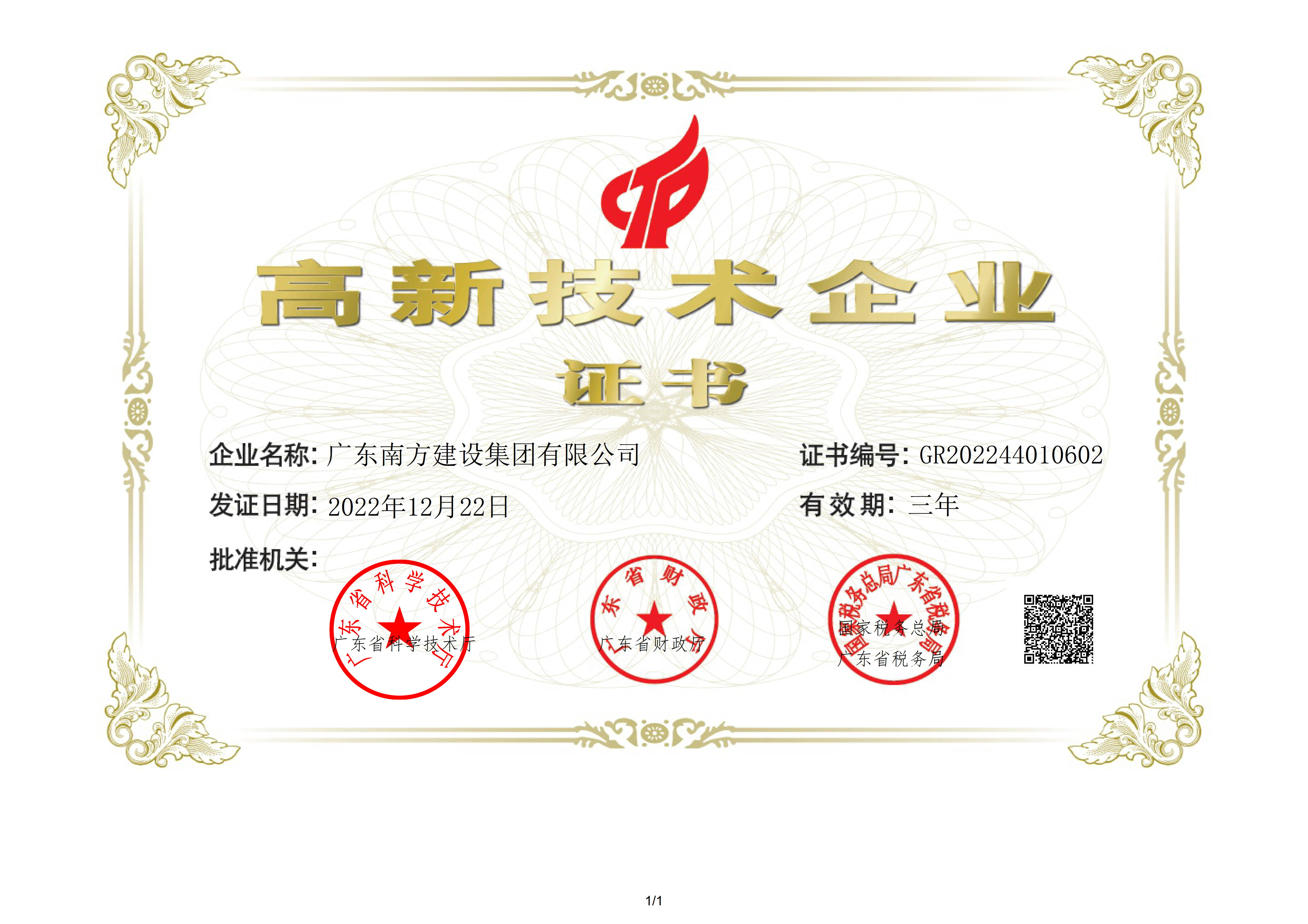 南方高新技術(shù)企業(yè)證書