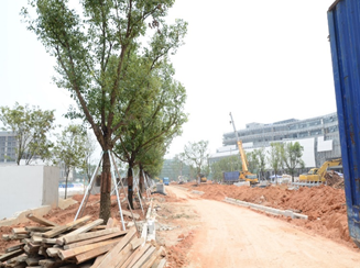往學(xué)校中心日晷廣場望去,學(xué)校中軸線道路兩側(cè)栽種了滿滿的香樟樹、人面子樹和鳳凰木等,并一一做好固定支架;校園內(nèi)主干道路正在清理施工廢棄物即將進(jìn)行瀝青鋪設(shè);人行通道同步開始鋪設(shè)園林透水磚,種植綠化草皮。午飯后的綠化工人們加緊種植綠化樹木,現(xiàn)場揮汗如雨。